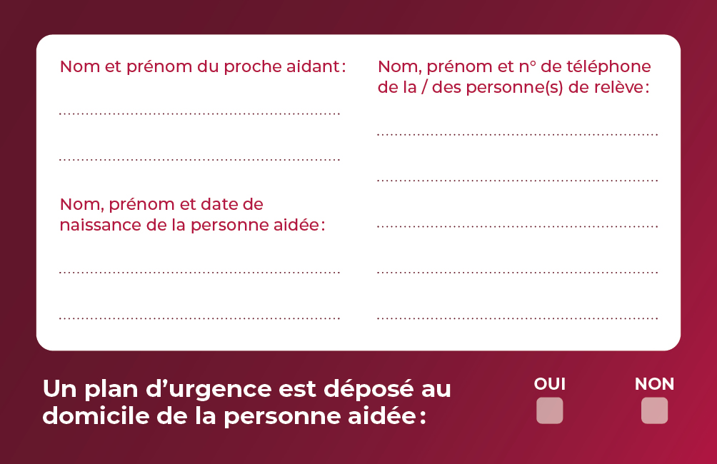 Ce document au format carte bancaire, personnalisé et plastifié, contient les informations essentielles pour assurer la continuité du soutien à domicile de votre proche en votre absence.